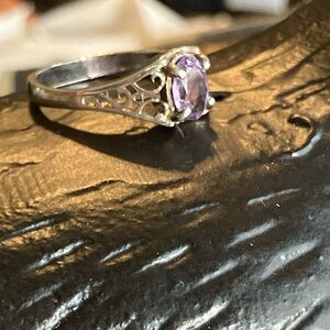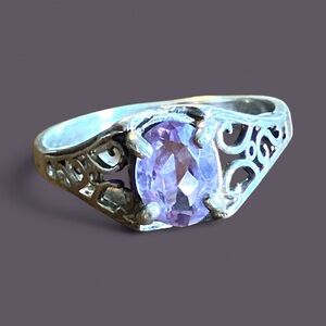Beautiful faceted oval cut amethyst set in a prong setting on dainty filigree band. Marked 925, not otherwise signed.