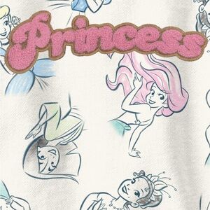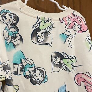 Adorable pullover top with Princess written in pink chenille. Features a graphic design of Snow White, Ariel, Mulan, Jasmine, Tiana, and Cinderella.