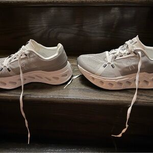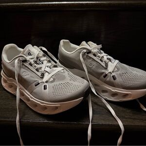 Sleek gray athletic shoes with white accents. Lightweight and breathable design. Perfect for running and training.