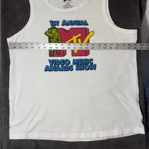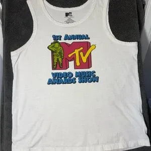 White tank top with MTV logo. Features pink, yellow, and blue design.
