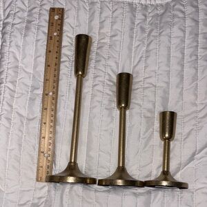 Elegant set of three gold candle holders. Perfect for home decor. New and never used. Each one holds one ten inch taper candle.