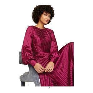 leena for Mac Duggal Pleated Long Sleeve Satin A-Line Gown in Berry NWT