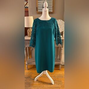 This RSVP by Talbots dress features a rich teal color with beautiful lace yoke (lace paneling on top), creating a refined and feminine look. The classic shift silhouette is flattering and easy to wear, making it a versatile choice for cocktail parties, weddings, or special occasions.