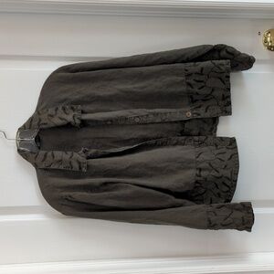 This beautiful green hemp blouse is from my own closet from the days before children when I had a disposable income. The top features a leaf and vine pattern embroidery and dyed green buttons that may be shell. The garment is in excellent condition because its hemp (See picture of armpit showing no wear). also available in brick colour