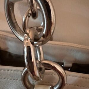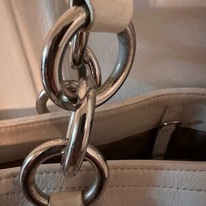 It features a zip-top closure, double leather handles with silver-tone interlocking rings, and side pockets with a turn-lock closure.