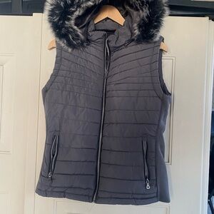 Elevate your winter wardrobe with this charcoal vest featuring a plush faux fur hood. Ideal for layering and adding a touch of elegance to your outfit.