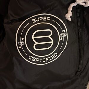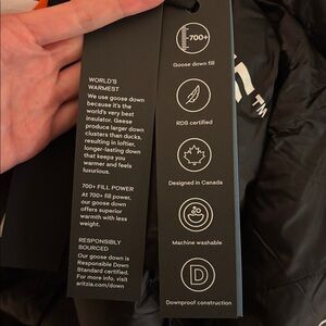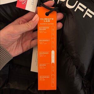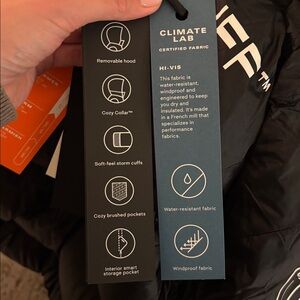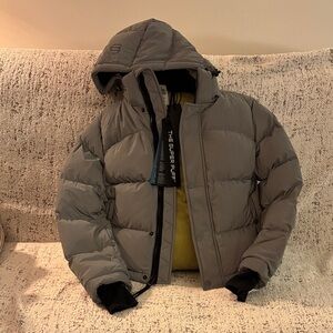 Iconic puffer jacket with a hood. New, never worn, tags still on. Perfect for windy, snowy weather.