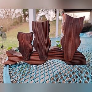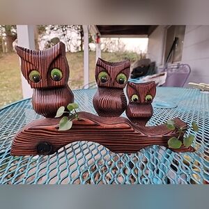 Vtg Witco Owl Cryptomeria Burnt Wood Carved Owls Retro Wall Art MCM Green Eyes