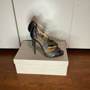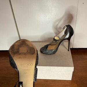 Authentic Jimmy Choo Lance Jelly high-heel sandals in a stunning silver/gold glitter finish. These iconic strappy heels feature a sleek open-toe design and elegant stiletto. Perfect for evening wear, special occasions.