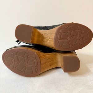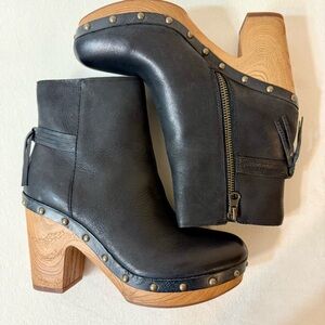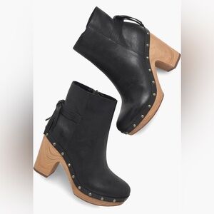 Kork-Ease Dianna Block Heel Platform Bootie in Black. Like new, retro inspired platform bootie with an almond-toe, antiqued studs, tassel trim and wood grain sole. Cushioned footbed. Leather upper. Manmade sole. Textile lining. 4.5” shaft. 3.75” heel with 1” platform.