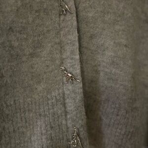 Chic light gray cardigan with a V-neck design. Features adorable dinosaur front closures. Soft and comfortable for versatile wear in a cozy warm alpaca blend. Mild pilling notes, as pictured.
