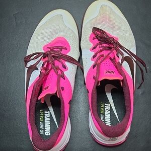 Stylish Nike shoes with a bold pink and white design. Ideal for workouts.