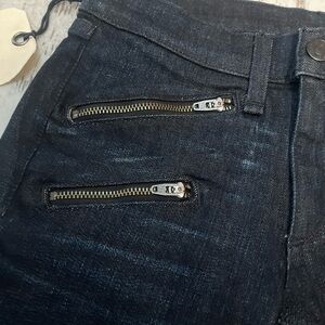 rag and bone kensington jeans, moto skinny jeans, zipper pocket jeans, dark wash skinny jeans, designer denim, women’s size 24 jeans, zip ankle jeans, cotton blend denim, stretch skinny jeans, NWT rag and bone, luxury denim