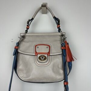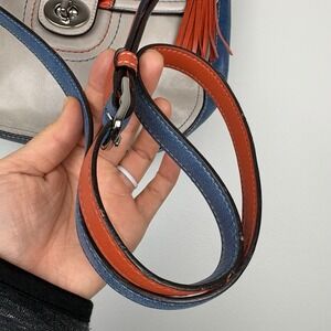 Rare Coach Willis 70th Anniversary Limited Edition colorblock leather bag, style 19031. This collector piece features premium glove-tanned leather with polished silver hardware, a turnlock front pocket, and tassel charm, Signature multicolor legacy stripe lining inside.