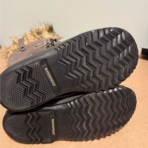 These classic sorels are in great shape! Tall, fur trim, warm felt liner. These boots are in excellent used condition. Grey suede/leather combo.