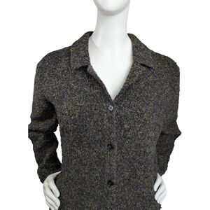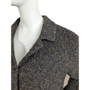 Textured vintage button-front cardigan by Deane & White in a rich brown mélange with subtle flecking throughout. Crafted from a cozy wool-blend bouclé knit, this piece has a soft collar neckline and a lightly structured, tailored silhouette.