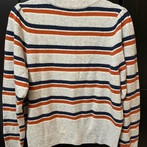 Stylish V-neck sweater by Madewell. Features gray base with orange and navy stripes. Perfect for casual wear.