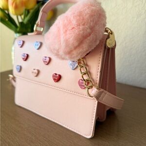 Betsey Johnson Conversation Hearts crossbody bag in pink with a top handle and a pink faux-fur heart charm