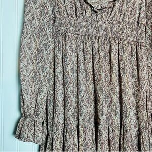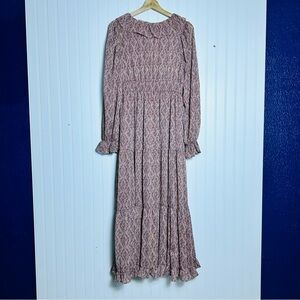 Chic long sleeve maxi dress by Moon River. midi maxi depending on your height dainty floral pattern colors of mauve and pinks long sleeve ruffled V neck tiered A line skirt pull on style elastic waist chiffon fabric with lining.