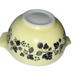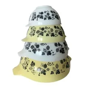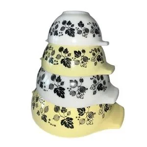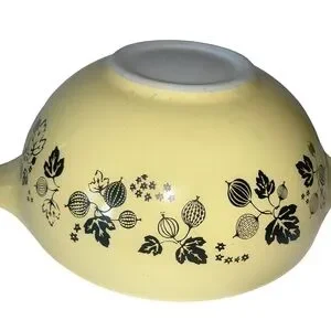 Stunning complete set of PYREX Yellow Gooseberry Cinderella nesting mixing bowls. This is a rare and highly sought-after collector’s set, featuring the full range of sizes with the iconic Cinderella pouring lips and handles.