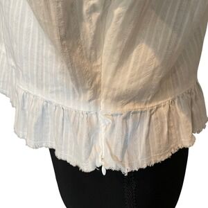 White textured ribbed cropped long sleeve top from Divided by H&M. Features a delicate ruffle neckline and a ruffled hemline with a raw edge finish. The back has a keyhole detail with a tie closure. The sleeves are full length with slight gathering at the shoulder.