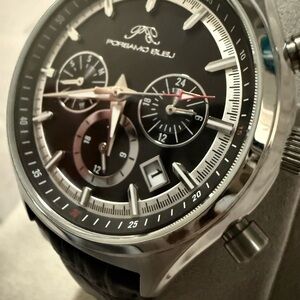 NWOT stainless steel and black leather mens watch. Never Worn. Still has protective film in place.