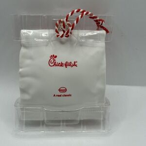 Material: plastic decorative ornament styled to resemble the iconic Chick-fil-A sandwich foil bag.