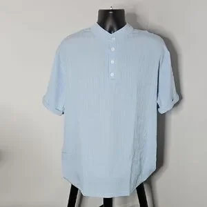 Effortlessly cool with a refined edge, this short-sleeve stand-collar shirt is perfect for those who appreciate clean lines and understated style. Designed with a minimalist band (mandarin) collar and partial button placket, it offers a modern alternative to a traditional button-down.