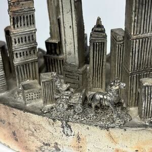 This product is a metal building replica of the Statue of Liberty and World Trade Center in New York City. Made in 1995. The souvenir features the iconic skyline of New York and weighs 13 oz. It is a vintage piece that showcases the historical significance of these landmarks, making it a unique and collectible item for those who appreciate American history and architecture.