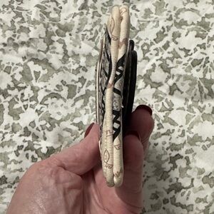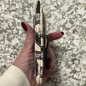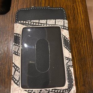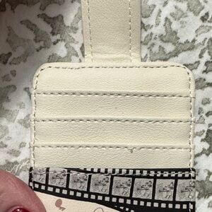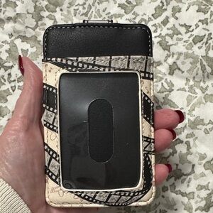 Stylish card holder with Mickey Mouse design. Features black and white film strip pattern. Perfect for Disney fans.