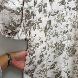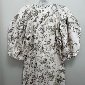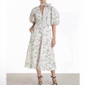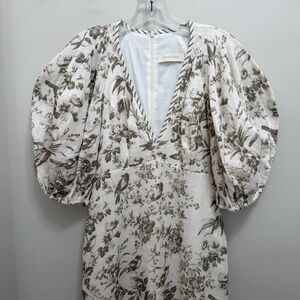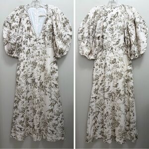 Zimmermann Linen Day Midi Dress Puff Sleeve Pockets Olive Green Toile Floral 6