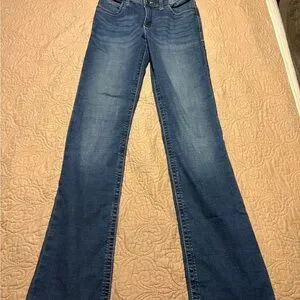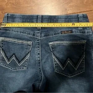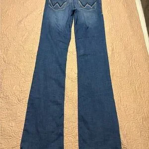Stylish flare jeans by Wrangler. Deep blue hue. Perfect for casual wear. Size in pictures.