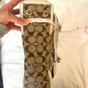 Vintage Coach Hampton Satchel in signature canvas with white leather trim. Fair condition- there is visible wear on the white leather straps and white leather corners, and the structure of the bag on the back side is a bit bent- see photos.
