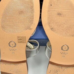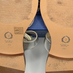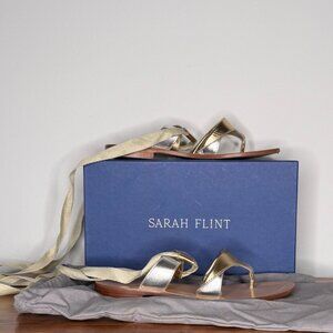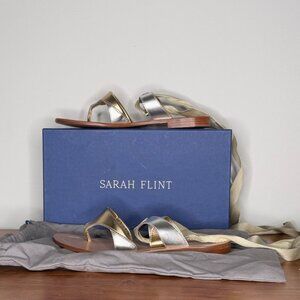 Stylish and chic sandals from the luxury shoemaker Sarah Flint, beautifully designed with shimmering gold and silver straps. Their elegant wrap-around style adds a lovely touch of sophistication to any outfit. Featuring a 10mm flat sole, round toe, and lace-up Grecian design, each pair is handcrafted on the Amalfi Coast in Italy.