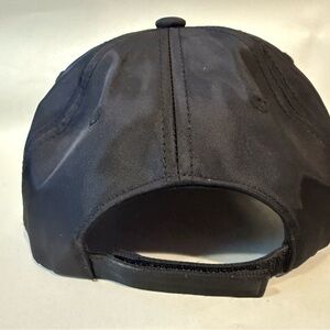Prada Re-Nylon baseball cap featuring the brand's iconic enameled metal triangle logo. The cap is made from Re-Nylon, a sustainable material produced from recycled ocean plastics, fishing nets, and textile fibers. It typically has a cotton lining and an adjustable strap at the back. Sold as is.