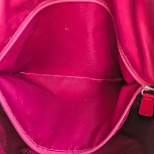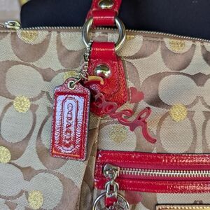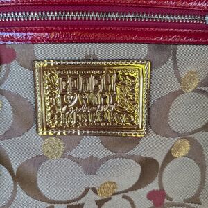 Stylish Coach tote with signature pattern. Features vibrant red accents and gold details. Perfect for everyday use.