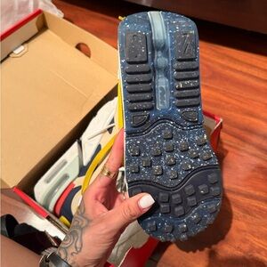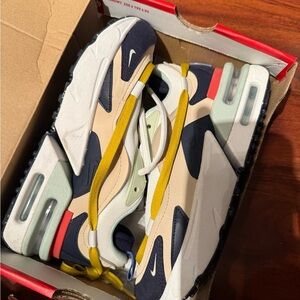Trendy sneakers with a mix of colors. Features navy, cream, and yellow accents. Perfect for casual wear. Superrrr cute and chunky shoe worn once