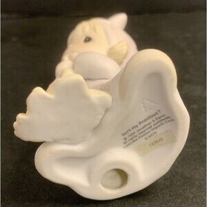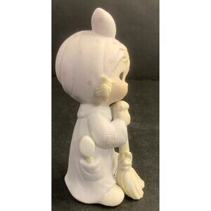 This vintage Enesco Precious Moments figurine from 1984 features a girl sweeping and is titled "ISN'T HE PRECIOUS?". The figurine, made of porcelain with a matte finish, is part of the Enesco collection and is now retired. It showcases intricate details and vibrant colors, making it a charming addition to any room decor. Perfect for collectors of Enesco figurines or fans of Precious Moments, this piece captures a nostalgic and heartwarming scene that is sure to bring a sense of joy and whimsy to any space.