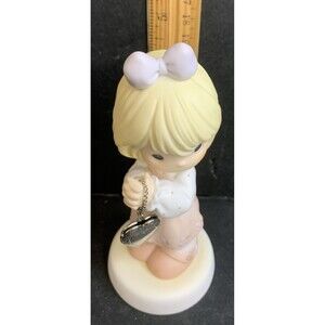 This is a Precious Moments figurine from 2003 titled 'Friends Are Held Within The Heart' featuring the character Ares holding hearts. It is made of porcelain with a multicolor matte finish. This American-style figurine is part of the Precious Moments collection and was manufactured in China. It is a single item and is not signed or handmade. Locket opens.