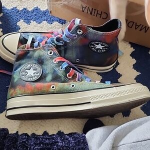 Vibrant high-top sneakers with a multicolor design. Features classic Converse logo. Colorful laces add a playful touch.