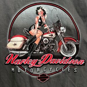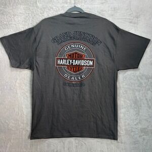 Keywords: harley davidson shirt, harley tee, harley graphic tee, dealer shirt, grand junction harley, colorado harley, motorcycle t shirt, biker tee, pin up graphic shirt, pinup harley, moto streetwear, y2k biker, mens large t shirt, charcoal gray tee, double sided graphic, bar and shield