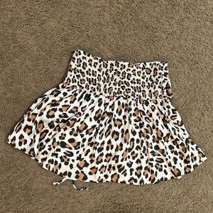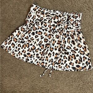 Aerie mini skirt in a bold leopard print with a silky smooth satin feel. Made from 100% viscose for a lightweight, flowy drape. Features a comfortable smocked back waistband, front fold-over detail with ruched accents, and adjustable tie strings for a customizable fit. Great preloved condition with no noticeable flaws.