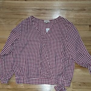 Chic wrap blouse with a checkered design. Features a flattering V-neck and tie detail. Ideal for versatile styling.