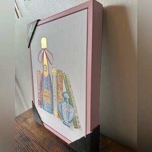 Luxury Designer Canvas Pink Framed Art with Books and Champagne Wall Decor NWT