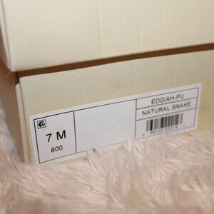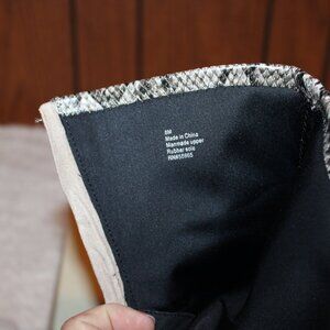 Open Edit GIAH - New in Box - SNAKE Print short boots. Man made materials. Two pairs available Size 7 and Size 8 . Black soles and 2 1/2 inch flared block heel. Small metal rivets/studs outline the boot. Rear Zipper. Both available pairs of Snake print boots are new in boxes and have never been worn.