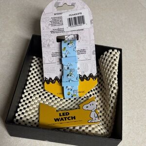 Peanuts LED watch with Snoopy design. Features a blue strap and yellow accents. Digital display with easy-to-read numbers.