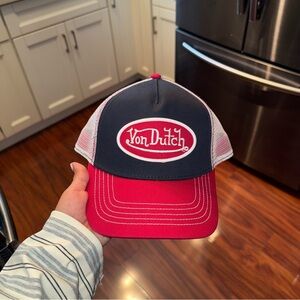 Classic trucker hat with bold Von Dutch logo. Red front with navy panel and mesh back.