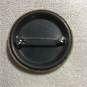 Round pin featuring a fairy in a garden setting. Vibrant pink flowers and lush green leaves. 1.8”. Small area with a tiny dent.