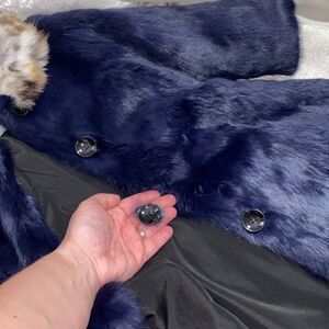 The coat is real rabbit fur dyed navy blue. The collar is a leopard print