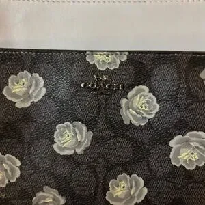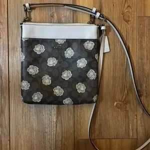 Stylish Coach crossbody bag with a rose pattern. Brown base with white floral details. Perfect for everyday use.